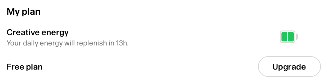 When you’re ready to unlock 100x more creative energy, navigate to your Account tab where you’ll see a My plan section. You can access your Account tab by clicking on the account icon in the bottom left of the Reve home panel.