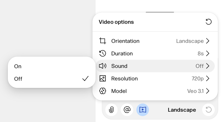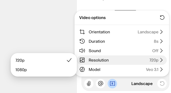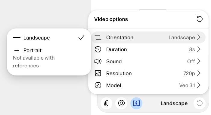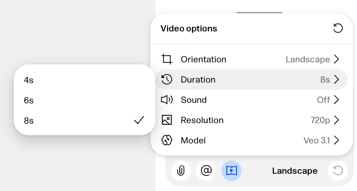 To access and edit all custom video settings, click the Landscape option in the bottom right of the chat interface. Changing your settings will impact how many video seconds are used per video. For more information on energy usage see here.