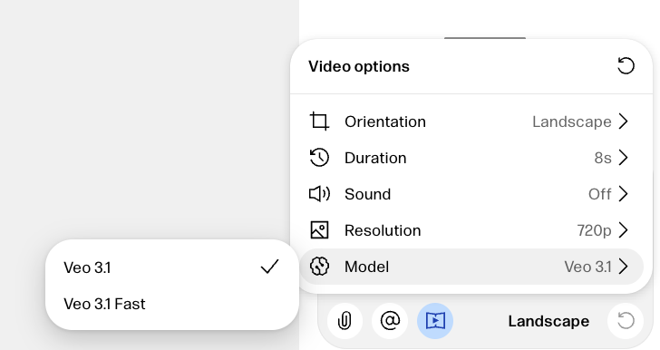 - Choose Veo 3.1 or Veo 3.1 Fast
