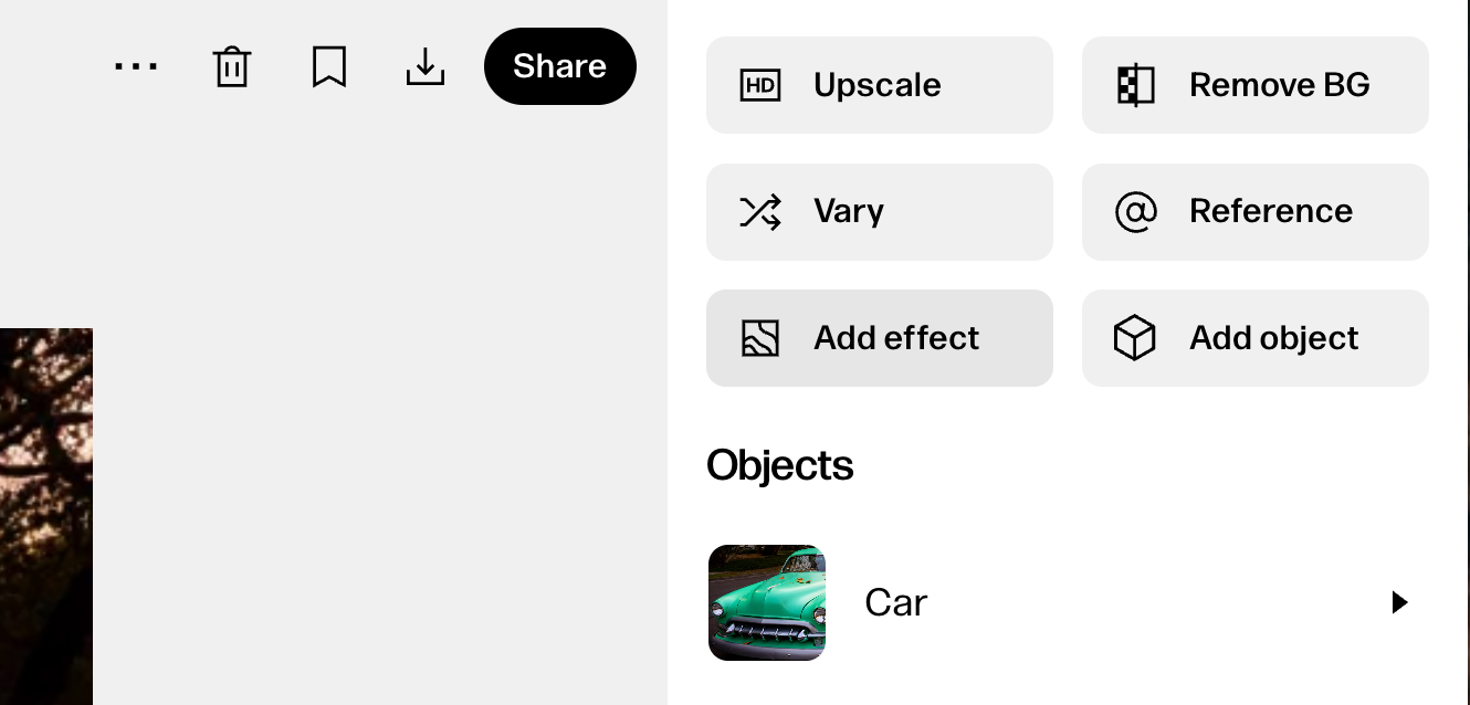 To remove the background, open the image in the editor and click Remove BG in the upper right. Reve will process your image and save a new transparent version in the same album, and your original image will be preserved to use again.