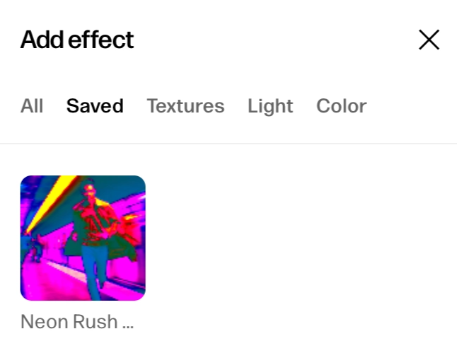 Your new effect will be available to apply to future work by selecting Add effect and then choosing it from the Saved tab.